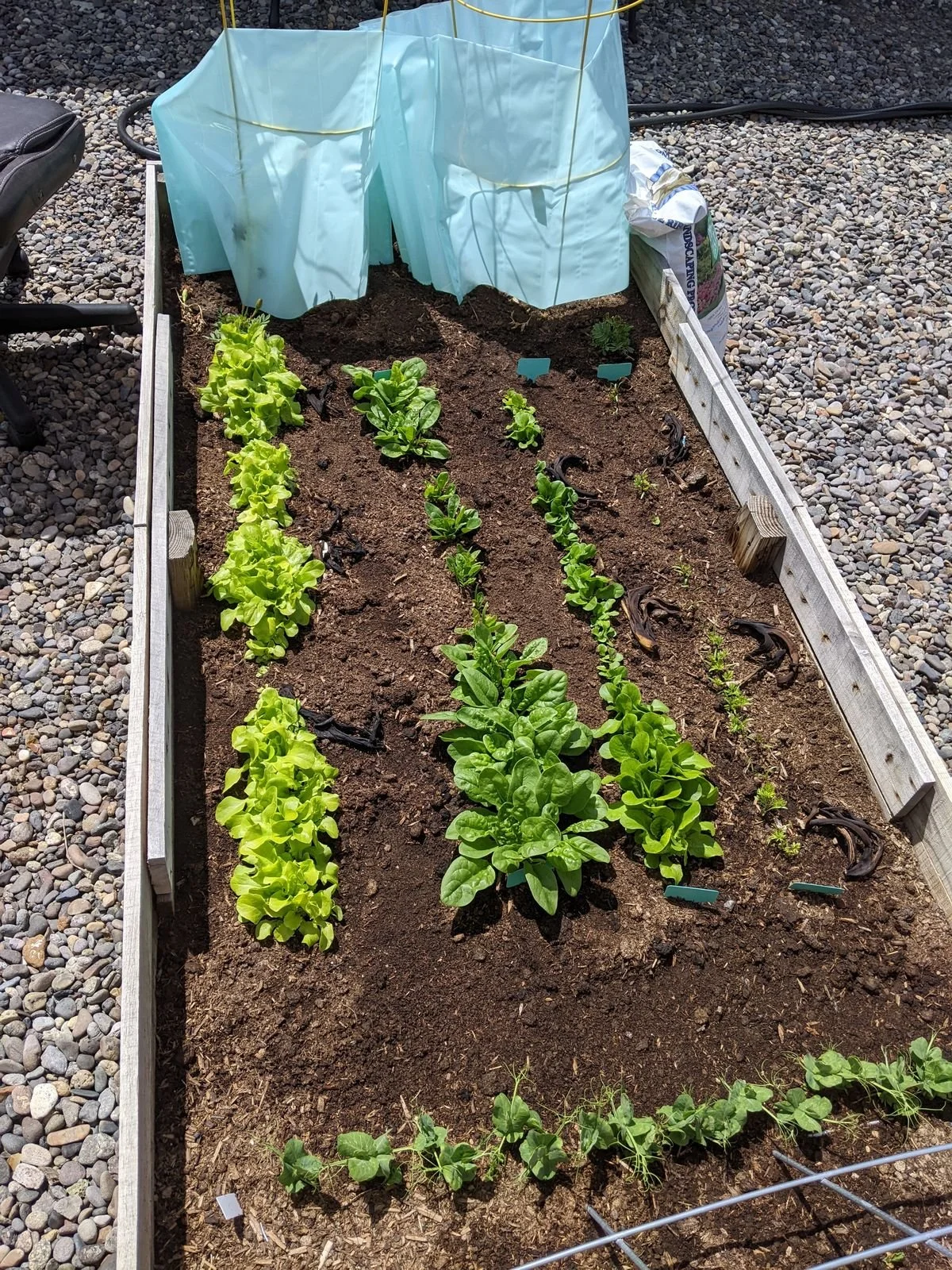 After the sides are all attached, line the bottom with cardboard to smother grass and weeds. Then fill with soil and start planting.